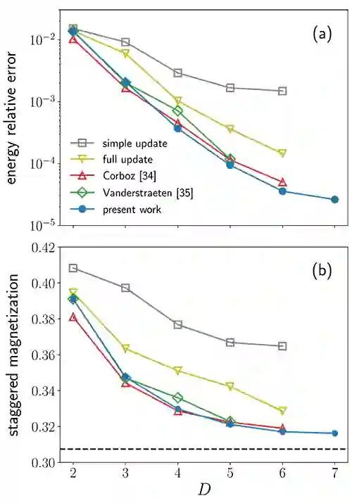 图一 (a)不同方法计算二维自旋1/2反铁磁海森堡模型基态能量的相对误差的比较;(b) 不同方法计算交错磁化强度的比较。