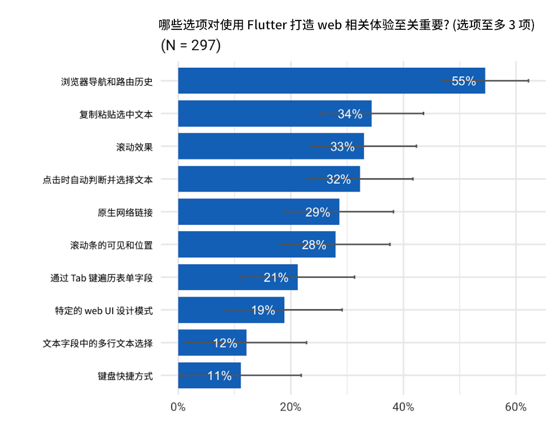 最后,团队还收到了关于工作流、性能和第三方 API 的反馈。在基本工作流方面,受访者认为 Flutter 在 web 端的调试是最困难的。页面加载速度和滚动是受访者最常遇到的性能问题。受访者希望 Flutter web 能够对本地存储 (例如 SQLite)、Firebase 存储和 Google 地图提供更好的支持。这些需求将随着团队推进 Flutter web 的开发进程而逐步满足。