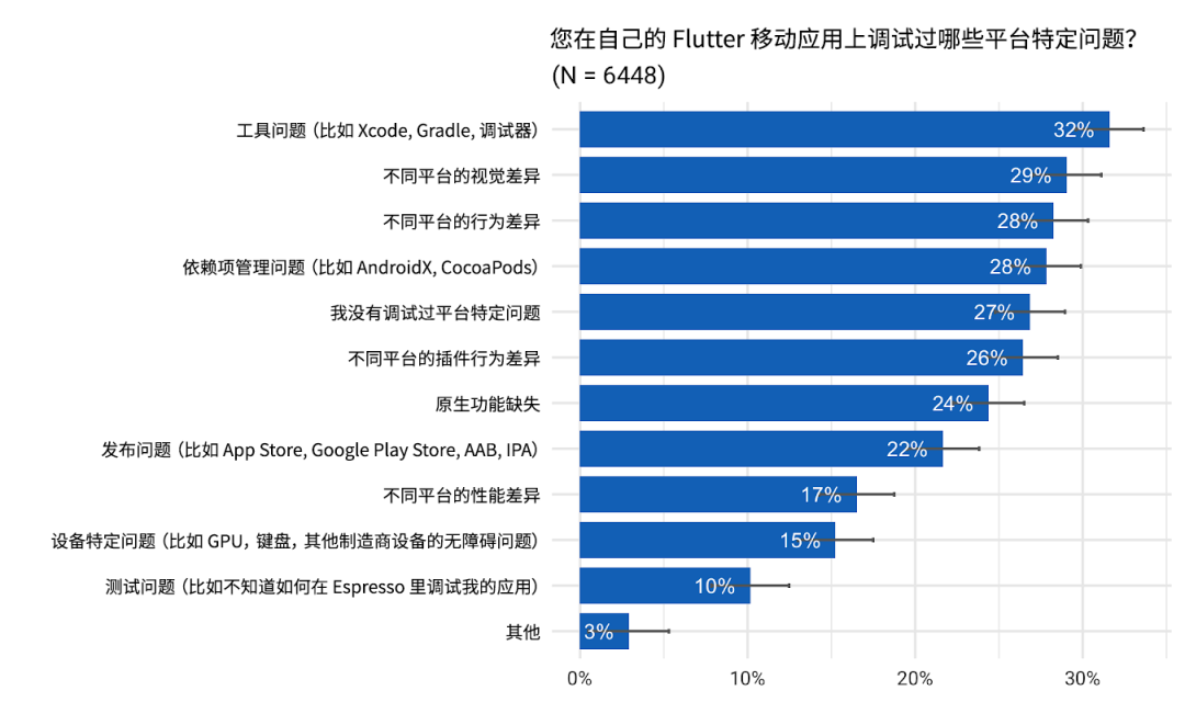 首先,我们询问用户调试了哪些平台特定问题。我们发现最常见的平台特定问题是工具问题 (32%),然后是不同平台的视觉差异 (28%)、依赖项管理问题 (28%)、不同平台的行为差异 (27%)、不同平台插件的行为差异 (26%) 以及缺失原生功能 (25%)。