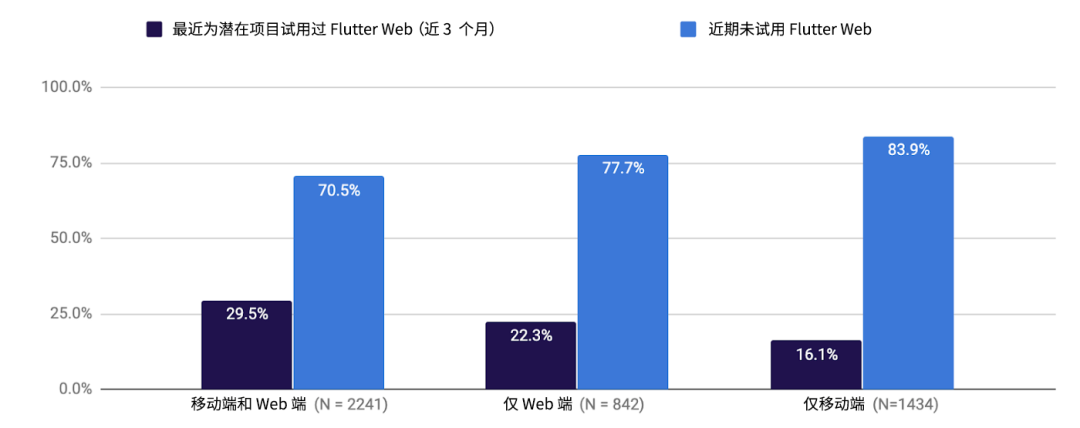 更具体地说,在兼具移动和 web 开发经验的用户中,有 29.5% 的用户在过去三个月中尝试在生产环境中使用 Flutter web。这一比例因开发者过去的平台经验而有所不同。数据表明,只有 web 平台开发背景的受访者正尝试用 Flutter 来替代他们的 web 开发框架 (22% 的此类受访者尝试过在生产环境使用 Flutter web),而只有移动开发背景的受访者则会积极尝试用 Flutter web 打开 web 开发的大门 (16% 尝试过 Flutter web)。