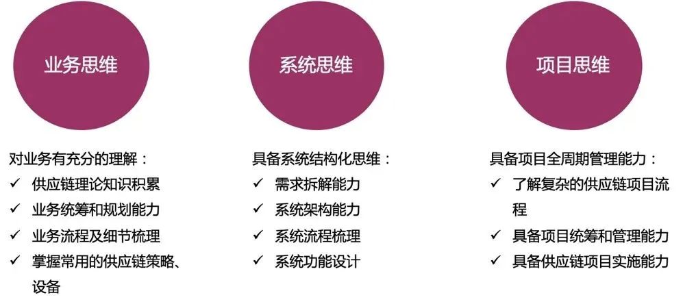 如果想成为一名比较资深的实战专家,需要具备三方面的思维:业务思维、系统思维和项目思维。 这些技能不管我们是做业务出身,还是做产品、技术出身,或者我们是不是做供应链,都是殊途同归的。