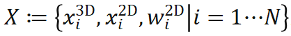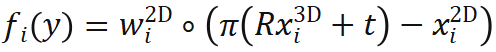 隐式方法则是基于几何优化的位姿估计方法,最典型的代表是基于 PnP 的位姿估计方法。这类方法中,首先需要在图像坐标系中找出 N 个 2D 点(第 i 点 2D 坐标记作),同时在物体坐标系中找出与之相关联的 N 个 3D 点(第 i 点 3D 坐标记作),有时还需要获取各对点的关联权重(第 i 对点的关联权重记作)。根据透视投影约束,这 N 对 2D-3D 加权关联点隐式地定义了物体的最优位姿。具体而言,我们可以找出使重投影误差最小的物体位姿: