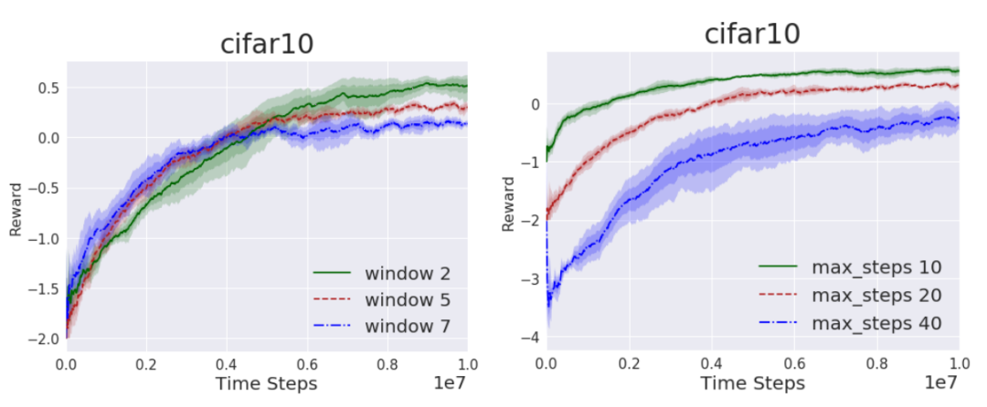 图3 CIFAR10结合PPO算法,(左)固定最大步数M=20,窗口大小变化曲线图;