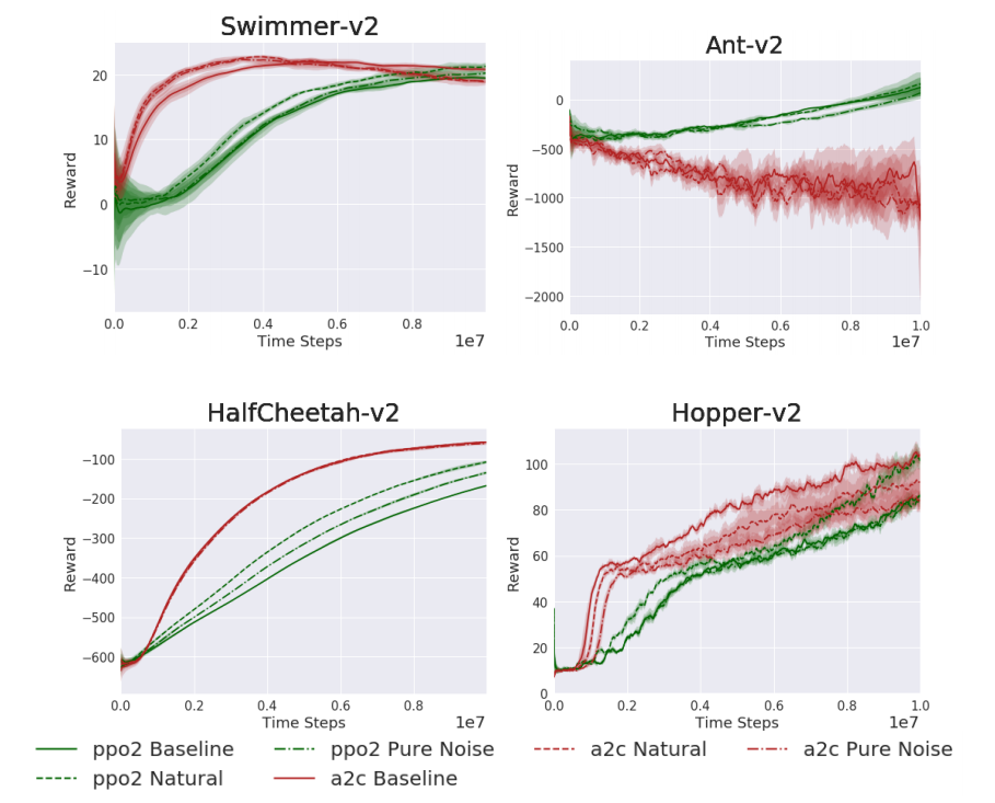 即使在观察中没有返回任何信息的情况下,PPO和A2C能够像观察中提供实际状态信息时一样学习良好的策略。结果表明,当前的RL算法是将MuJoCo任务作为一个开环控制系统来求解的,在决定下一步动作时完全忽略了输出,说明MuJoCo可能不是RL算法的一个强大基准。