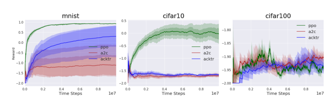 更耐人寻味是,当在3个数据集上从3层CNN到ResNet-18测试时,都可看到性能下降。PPO仍然能够在MNIST和CIFAR10上获得相同的性能,这两个数据集都是10分类任务,但是ACKTR和A2C受到了巨大的影响。没有一个算法在ResNet-18和100分类任务中表现突出。这融合了两个更困难的问题:现在行动空间是10倍大;还要学习10倍多的概念。