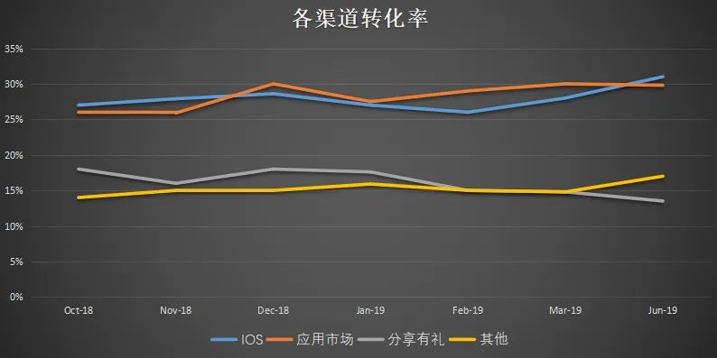 · IOS和应用市场转化率基本上没有太大的浮动,总的趋势来看是略微向好的方向发展的,但是分享有礼的渠道转化率从4月份开始不断的下降,其他渠道表现不是特别明显