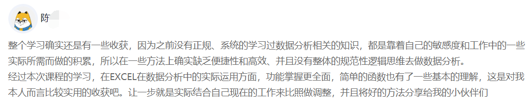 3. 学完可以使用Excel完成基本的数据分析操作——比如数据清洗时缺失数据/重复数据的处理、数据类型的转化、数据分析时用到的数据透视表、Vlookup函数等,学会后帮她节省了至少60%的时间。