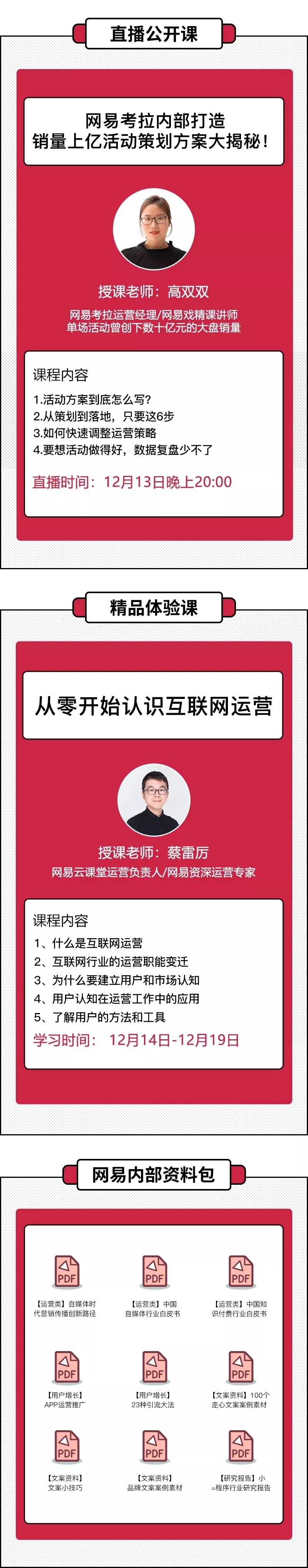 12月13日,网易云课堂安排了一场直播公开课,为想要提升运营技能的同学们答疑解惑。同时还有《互联网运营》精品体验课和《网易内部运营资料包》免费赠送。