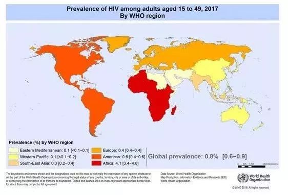 数据显示,截至2017年底,全球共有3690万人感染艾滋病毒。据估计,全世界15-49岁成年人中有0.8%携带艾滋病毒,各国和各区域之间的艾滋病毒情况仍有很大差异。非洲区域仍然是受影响最严重的地区,每25名成年人中有近1人(4.1%)感染艾滋病毒,占全世界艾滋病毒感染者的近三分之二。