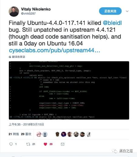 Twitter 上 Nikolenko 发推表示 Ubuntu 最新版本存在一个本地提权漏洞,攻击者通过该漏洞可以直接获取 root 权限。该漏洞(CVE-2017-16995)早在老版本中已经完成修复,但是在 Ubuntu 16.04 版本中依旧可以被利用。