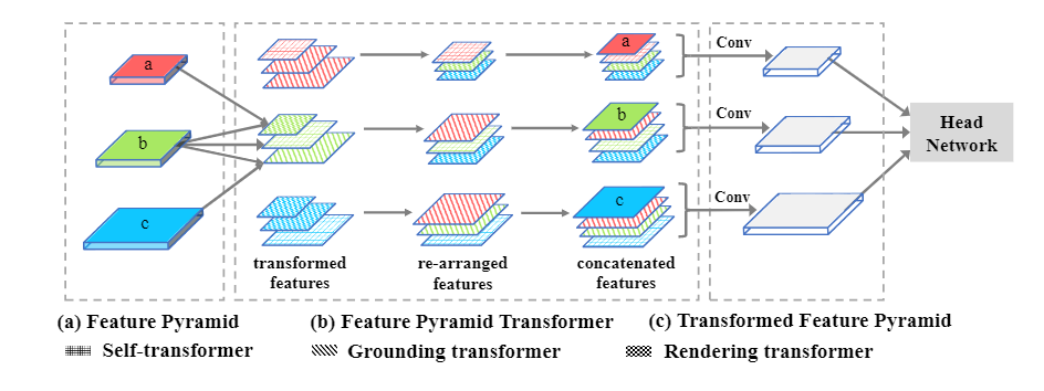 图2. 本文提出的FPT网络的总体结构。不同的纹理图案表示不同的特征转换器,不同的颜色表示具有不同比例的特征图。“ Conv”表示输出尺寸为256的3×3卷积。在不失一般性的前提下,顶层/底层特征图没有rendering/grounding 转换器。