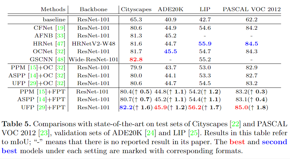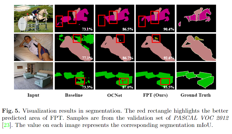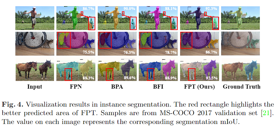 大量的实验表明,FPT可以极大地改善传统的检测/分割网络:1)在MS-COCO test-dev数据集上,用于框检测的百分比增益为8.5%,用于遮罩实例的mask AP值增益为6.0%;2)对于语义分割,分别在Cityscapes和PASCAL VOC 2012 测试集上的增益分别为1.6%和1.2%mIoU;在ADE20K 和LIP 验证集上的增益分别为1.7%和2.0%mIoU。
