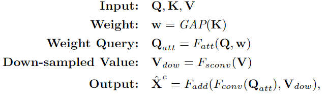 在本文的实现中,RT不是按像素进行的,而是按整个特征图进行的。具体来说,高层特征图定义为Q,低层特征图定义为K和V,为了突出渲染目标,Q和K之间的交互是以通道导向的关注方式进行的,K首先通过全局平均池化(GAP)计算出Q的权重w。然后,加权后的Q(即Qatt)通过3×3卷积进行优化,V通过3×3卷积与步长来缩小特征规模(图3(d)中的灰色方块)。最后,将优化后的Qatt和下采样的V(即Vdow)相加,再经过一次3×3卷积进行细化处理。
