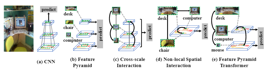 跨空间和尺度的特征交互是现代视觉识别系统的基础,因为它们引入了有益的视觉环境。通常空间上下文信息被动地隐藏在卷积神经网络不断增加的感受野中,或者被non-local卷积主动地编码。但是,non-local空间交互作用并不是跨尺度的,因此它们无法捕获在不同尺度中的对象(或部分)的非局部上下文信息。为此,本文提出了一种在空间和尺度上完全活跃的特征交互,称为特征金字塔Transformer(FPT)。它通过使用三个专门设计的Transformer,以自上而下和自下而上的交互方式,将任何一个特征金字塔变换成另一个同样大小但具有更丰富上下文的特征金字塔。FPT作为一个通用的视觉框架,具有合理的计算开销。最后,本文在实例级(即目标检测和实例分割)和像素级分割任务中进行了广泛的实验,使用不同的主干和头部网络,并观察到比所有baseline和最先进的方法一致的改进。