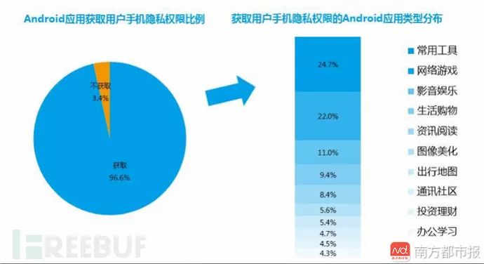 对于这些强制申请的权限,是不是会影响app提供服务呢?大部分的情况下并不会。事实上,越界获取用户隐私权限的现象十分普遍。根据腾讯社会研究中心与DCCI互联网数据中心19日联合发布的《2017年度隐私安全及网络欺诈行为分析报告》,96.6%的Android应用会获取用户手机隐私权。