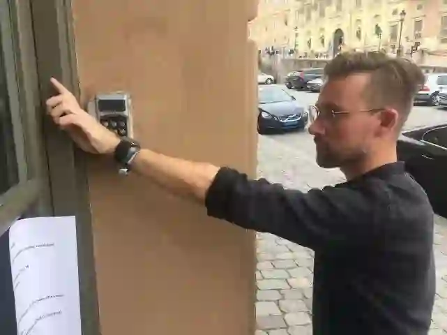 (一名植入芯片的瑞典人正在打开办公室大门)