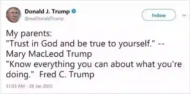特朗普也把他妈的人生信条常常挂在嘴边:相信上帝、忠于自己