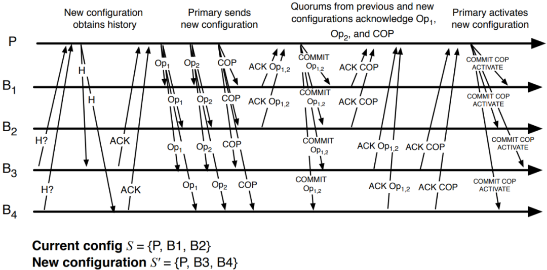 为了让新节点追上最新数据,新成员配置S’中的新节点B3、B4先连接到当前的主节点P,P会向它们传输自己当前的状态作为他们的初始状态。在Zab协议中当备节点连接上主节点时这样的状态传输就会自动发生,并且会继续从主节点P接收所有后续的操作日志(例如图中的Op1和Op2),这个过程中节点B3、B4不参与投票。