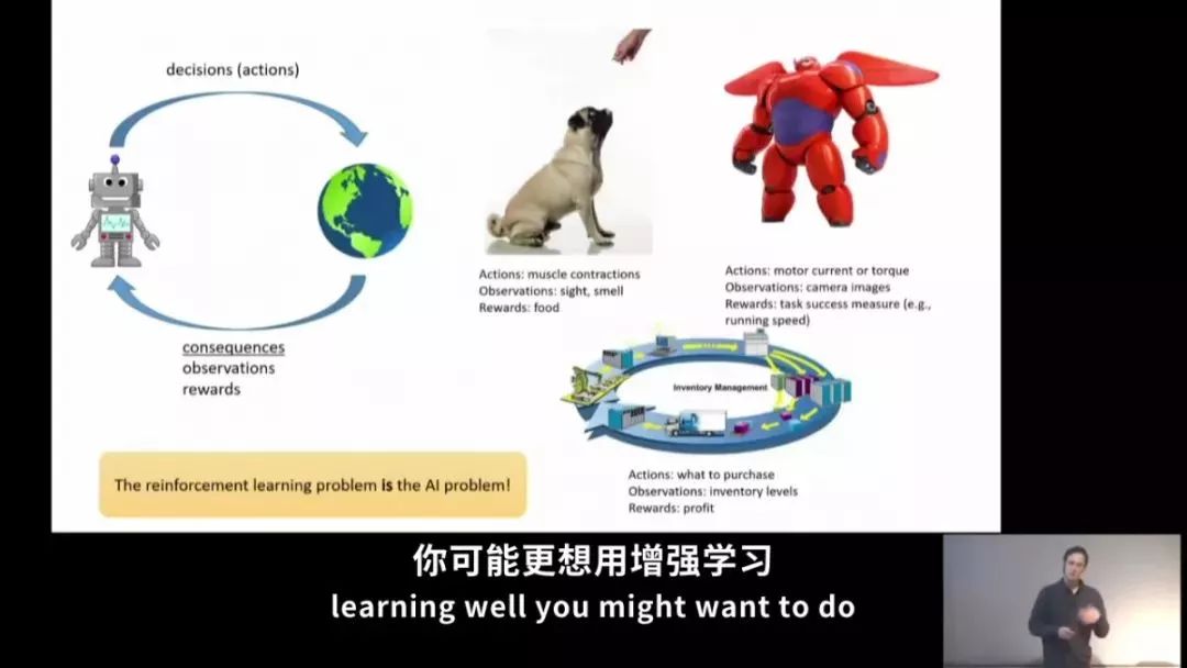 侧重于增强学习与深度学习相结合,应用在机器人方面的例子比较多,翻译的话老师语速挺快的,虽然语气词比较多,整体逻辑很清晰。