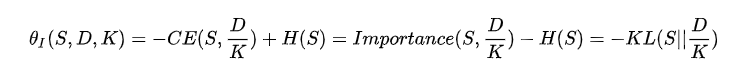 论文在理论部分的最后还提到了一个概念叫potential information。这个概念的目标主要是为建模informativeness目标提供上界。具体来说,potential information 建模的是D与K的分布差异。简单来说就是在背景知识K的条件下,我们能从D获取的新的信息量。其同样使用交叉熵来建模两个分布的差异,公式如下: