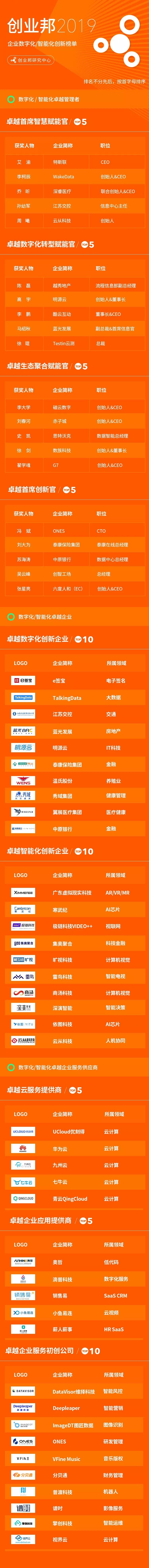 创业邦“2019企业数字化/智能化创新榜单”如下: