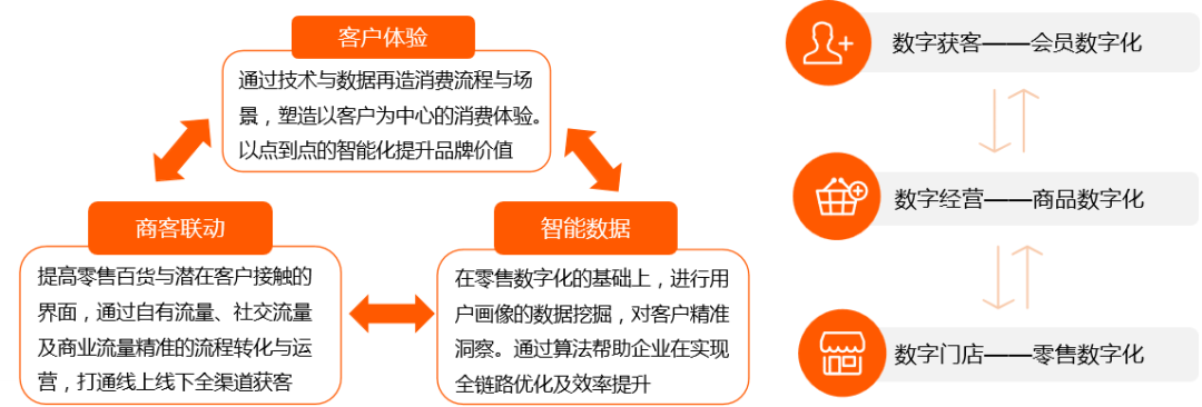数字化是零售百货转型过程中的基础,是进行所有服务升级、运营优化的关键,为数据驱动“人-货-场”的重构提供了坚实的基础。商品数字化带来的数据增量可以构建以客户体验为中心的场景模式,进而更好地优化供应链;更完整的数据维度产生更精准的用户画像,配合数字化会员体系,带来更好的购物体验。
