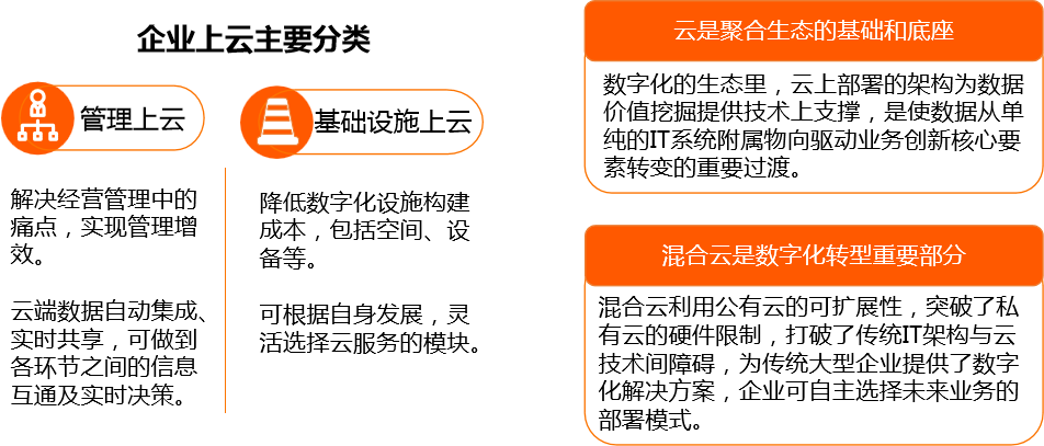 企业上云,指将企业的基础设施、管理及业务部署到云端,便捷地获取云服务商提供的计算、存储、数据和安全等能力。云服务具有资源共享、集约高效、弹性可扩展、高动态性能保障等优点。