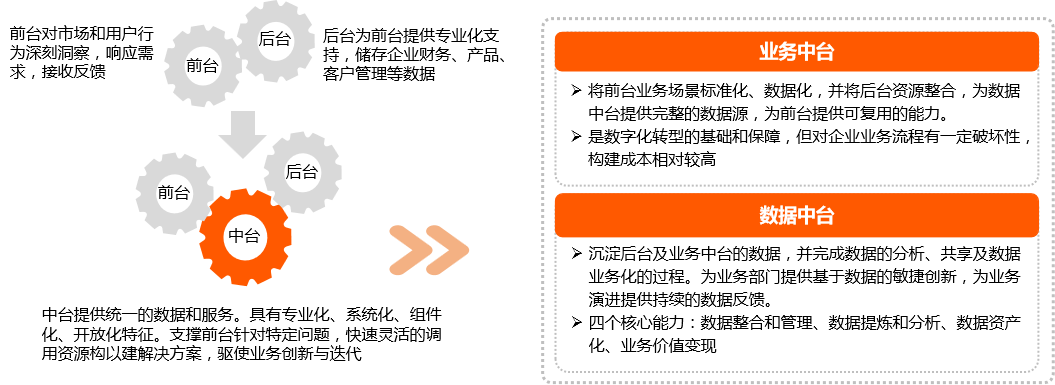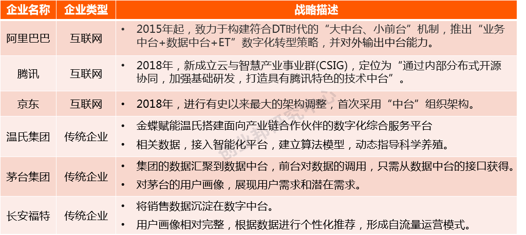 科技巨头从集团层面推动以搭建中台为目标的组织架构变革,传统大中型企业数字化转型方向以搭建数字中台为主。