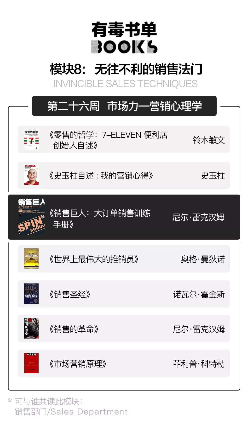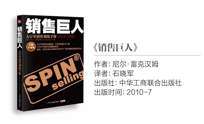 《销售巨人》是由尼尔·雷克汉姆专门针对销售中大订单这一细分领域,结合自身多年服务于世界一线品牌销售的经验,以及大量的销售实例观察,总结出的一本权威性经典书籍,他在书中创造性地提出了专门应用于大订单销售且十分有效的SPIN销售模式。这种模式是一种用于向客户提问和开发潜在客户需求的工具,几乎成为所有大客户销售经理必须掌握的专业技能。目前SPIN销售模式被诸如华为通讯、阿里巴巴、奥迪汽车、艾默生电器等众多世界500强企业广泛应用,效果显著。