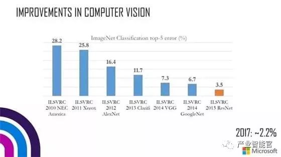 我们也看到过去 8 年多在语言处理和语音识别方面出现了类似的进步。今年,微软通过基于 CNN 和双向 LSTM 的架构实现了语音识别的 human parity。