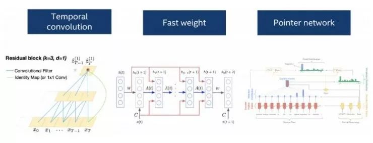 在深度学习的拓扑结构方面,一个自编码器(auto-encoder)模型可以被改进为一个序列到序列(seq2seq)模型用于处理顺序语言数据。注意力机制(attention mechanism)解决了随着时间的推移,解码网络应该如何对输入的编码做出响应。指针网络(Pointer network),作为注意力模型的一种变体,专门用于在输入序列中寻找词语的位置,它为机器阅读理解和文本摘要提供了一种新的处理机制(Machine Comprehension Using Match-LSTM and Answer Pointer,https://arxiv.org/abs/1608.07905;Get To The Point: Summarization with Pointer-Generator Networks,https://arxiv.org/abs/1704.04368)。通过增加快速权重(fast weights),(Fast Weights to Attend to the Recent Past,https://arxiv.org/abs/1610.06258)短期联想记忆的概念可以和长期序列的学习结合到一起。