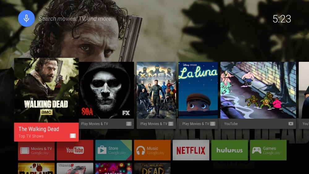 2014 年 11 月谷歌公布了安卓 TV,安卓继续进行它带着一块屏幕征服一切的征程。这家公司里的一个部门之前在蜂巢时代尝试过用谷歌 TV 掌控客厅,但这次完全是来自安卓团队的新点子。安卓 TV 使用安卓 5.0 棒棒糖,并给了它一个为室内最大屏幕设计的 Material Design 界面。首发硬件谷歌选择了华硕来代工“Nexus Player”,这是一个配置不足但够用的机顶盒。