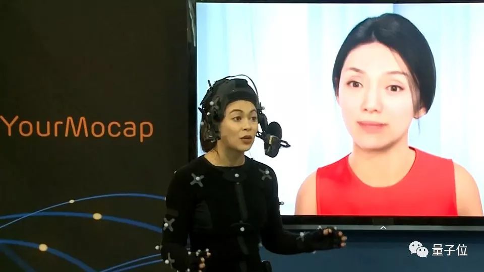 一个真实的女性人类在现场侃侃而谈,她的表情、动作、声音,被实时的赋予身后大屏幕上的女性数字人类Siren。