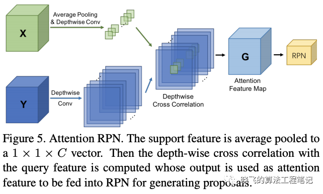 论文提出新attention网络,该网络能够在RPN模块和多关系检测模块中学习辅助集与查询集间的通用的匹配关系。网络为包含多分支的权重共享框架,一个分支用于查询集,其它则用于辅助集(为了方便,图4只画了一个分支),对于同类别的辅助分支,使用平均特征图作为辅助特征图。查询分支的权重共享主干为Faster R-CNN(包括RPN),使用这个分支来训练辅助集和查询集的匹配关系,能够学习到同类别的通用知识