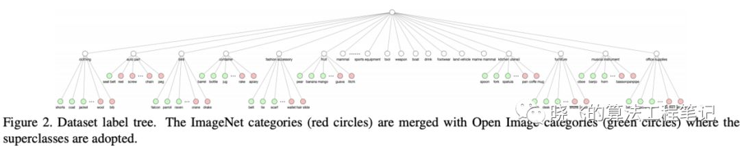 新训练集基于ImageNet(选了531类)和Open Images dataset V4(选了469类),但训练集间的类别不同,为了防止合并后存在漏标的情况,先对label进行分析和合并成树状结构,补充标注,然后去掉标注质量差的图片,包括包含目标太小(
