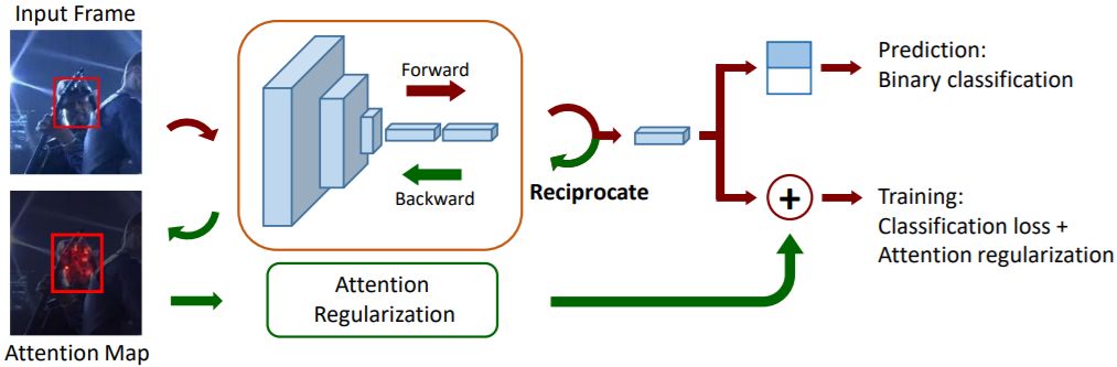 上图展示了新提出的往复式学习算法总览。该算法会首先在前向过程中计算给定训练样本的分类分数,然后在后向过程中通过取该分类分数相对该样本的偏导数来得到显著性响应图。之后再将这个响应图作为正则化项与分类损失结合起来用于训练分类器。测试阶段不会生成响应图,而是由分类器直接预测目标位置。