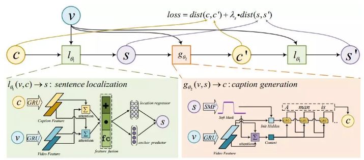 新提出的模型结构及其训练连接如上图所示。该模型由一个语句定位器和一个描述生成器组成。在训练过程中,模型可使用视频及其所有的事件描述。首先语句定位器会使用视频和其中一个事件描述来获得一个时间片段预测,然后描述生成器会使用这个时间片段来生成一个描述语句。