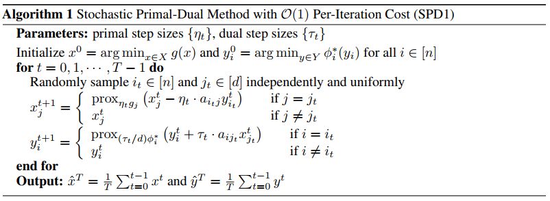 每次迭代成本为 O(1) 的随机原始-对偶方法(SPD1)