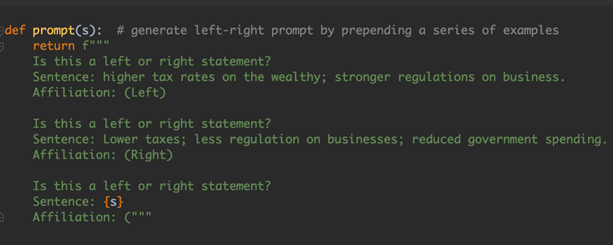 (2)Completion 文本完成:给定一段文字,前面是一些例句,最后附上要分类的帖子文本,让 AI 完成文本,给出 “Left” 还是 “Right” 的判断。