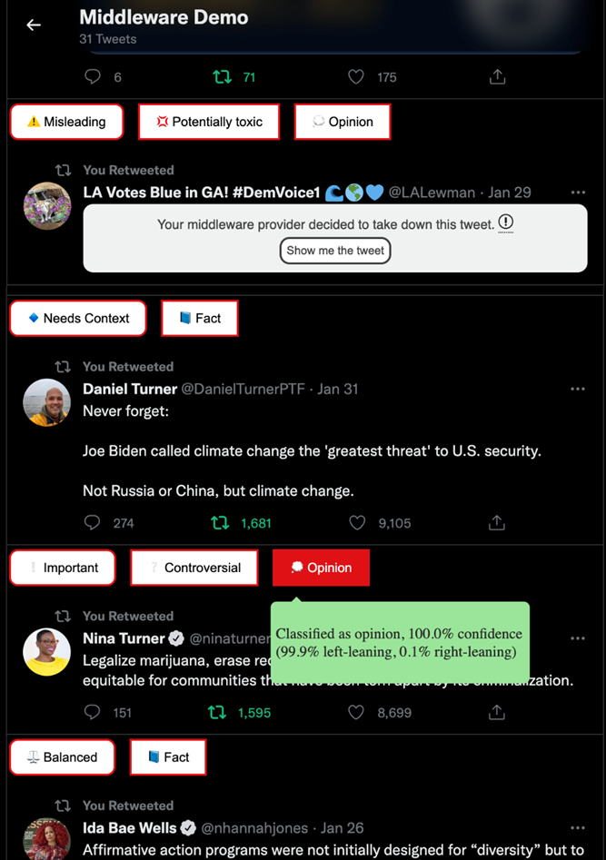 “中间件”提供商会有很多,可能各自有自己的政治立场,用户可以自行选择使用哪个“中间件”的服务。这样一来,可以帮助实现舆论仲裁、信息传播的去中心化。
