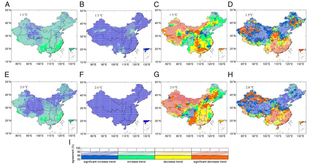 结果表明,无论在哪一种经济发展模式下,中国的干旱损失都会增加。但是,2摄氏度远比1.5摄氏度的损失高出许多。如果经济发展模式是以增长为导向的,那么增幅2°C后的年平均干旱损失甚至是1.5°C的两倍。