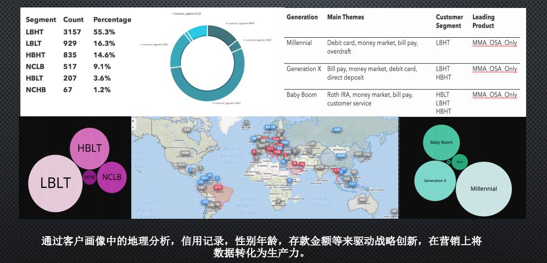 整合海量客户信息,得出客户和客户行为的故事,改进产品开发和营销的战略方法,银行需要从不同的角度去了解他们的客户体验。不仅仅是不同年龄阶层,还有不同交易金额和账户余额的用户,使用安卓系统和苹果系统进行理财的客户,以及现有的和潜在的客户群体,并将客户体验运用到商业决策中。