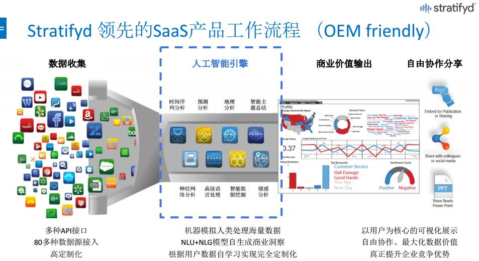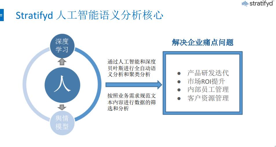Stratifyd大数据分析平台是Stratifyd大数据团队设计和研发的快速分析响应解决方案,其核心是以非结构化数据的AI处理为主,将非结构化文本数据和所有结构化数据有机的结合起来。