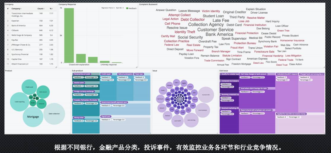 利用自助分析,最大限度地使用数据,有效监控业务各环节运营情况,充分了解行业与竞争者情况。银行非常关注投诉原因以及投诉者身份的数据,他们非常希望能够通过可视化获得的见解帮助他们改进客户服务,并通过按照不同条件的筛选能力分析根本原因来了解这些投诉,提高用户体验。