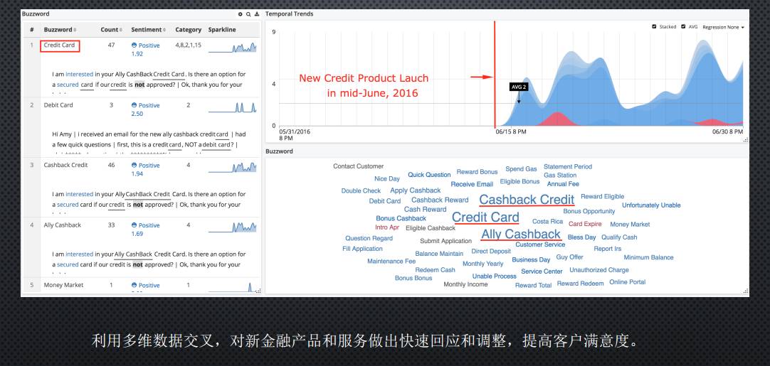 银行需要快速定位客户对金融产品和服务集中咨询的领域如货币市场,储蓄卡,账单支付,电汇转账等。并即时解决客户困扰,优化客户体验,这样才能更有把握地通过事实数据对新上线的产品和服务进行监控和管理。