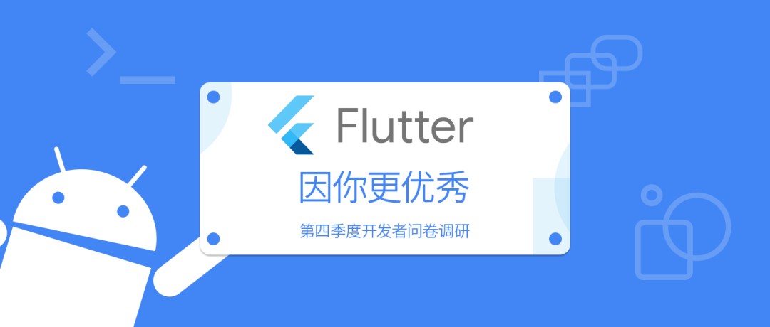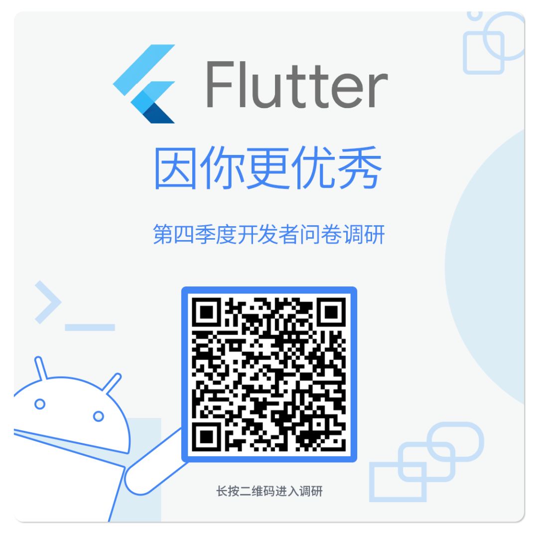 Flutter 因你而变得更优秀。感谢各位中国开发者们一直以来对 Flutter 的热切关注,我们诚挚地邀请您参与第四季度的线上调研,帮助 Flutter 团队更好的改进产品及提升开发者的使用体验。