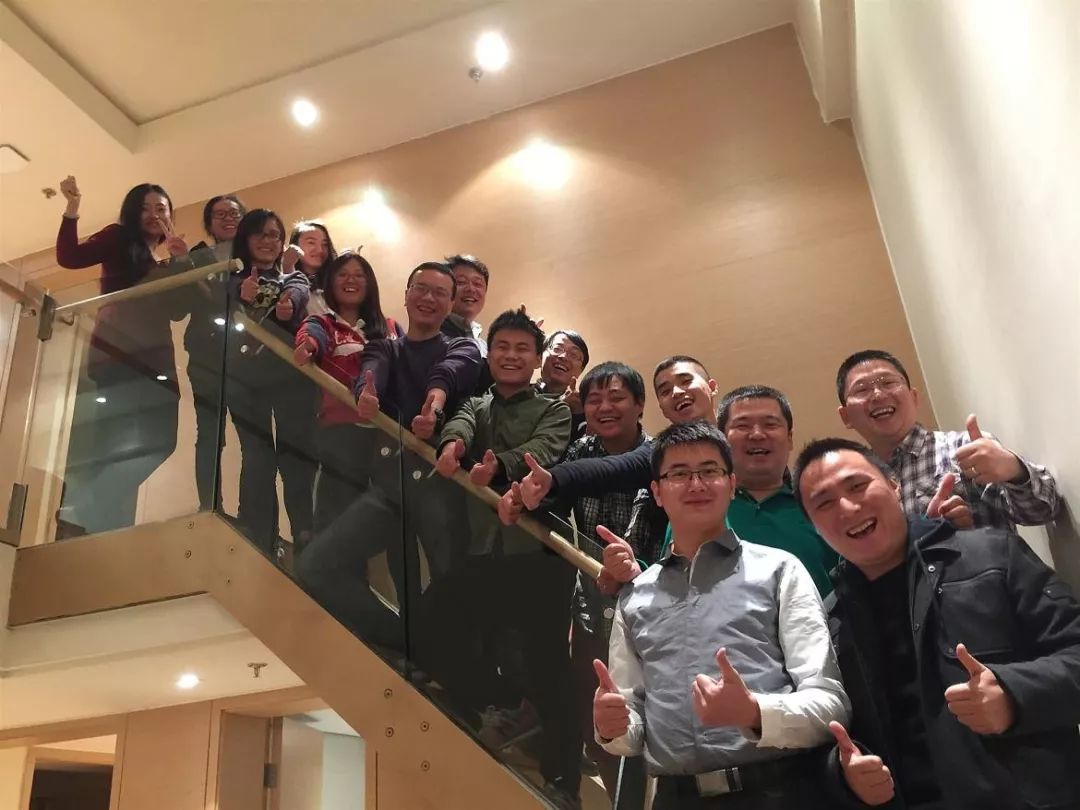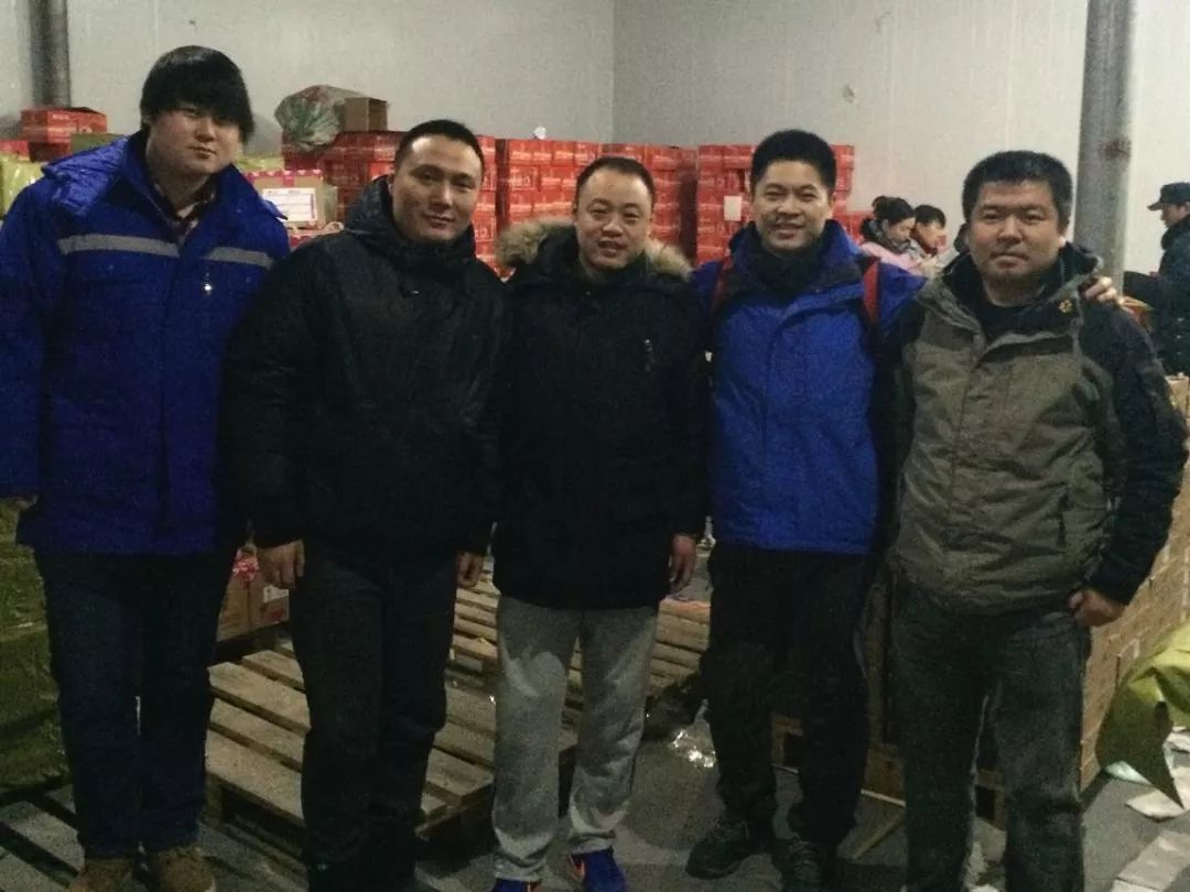 每日优鲜联合创始人兼总裁曾斌(右一)与物流部员工在公司年会中