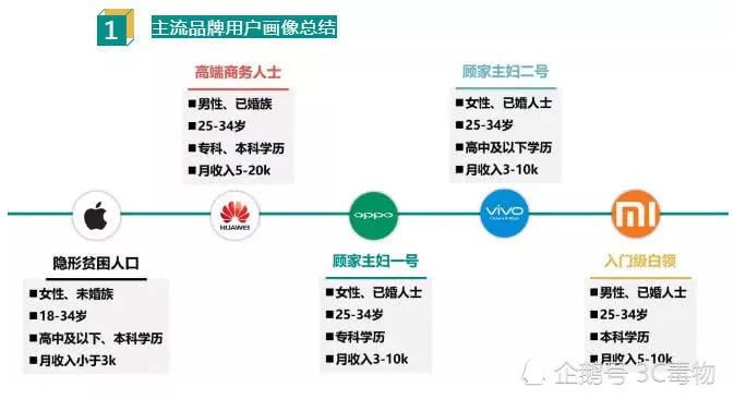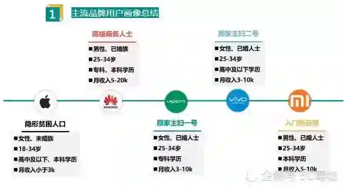 在MobData研究院的这组报告中显示,绝大部分购买苹果手机的消费者以未婚女性为主,年龄在18-34岁之间同时月收入小于3000元。而华为使用者的用户自画像则是以男性为主,年龄在25-34岁之间,月收入在5千元至2万元之间。蓝绿阵营厂商OV的消费群体非常接近,主要是以家庭主妇为主,年龄在25-34岁之间同时月收入在3千至1万元。小米用户群体也主要是以已婚男性为主,月收入主要在5千至1万元之间。华为和小米的主要用户主要是高端商务人士和入门级白领,而苹果手机的消费群体则是隐形贫困人口。
