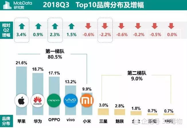 目前在一线城市到五线城市中仍然是苹果手机保有量是第一,苹果手机保有量最大的是一线城市,保有量达到39.9%。其次是保有量为新一线、二线、三线城市,保有量分别是25.6%、25.5%、23.3%。最后是四线和五线城市,保有量分别为18.1%、17.8%。同时在国内手机市场中第一梯队手机品牌为苹果、华为、oppo、vivo、小米,而三星、魅族、金立、乐视、中兴等手机则已经属于第二梯队。而第一梯队的手机品牌已经占据国内手机市场的80.5%,第二梯队的手机品牌在国内市场占有率为9%。