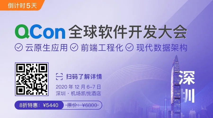 QCon 全球软件开发大会以“技术干货”为目标,关注前沿技术发展趋势,分享技术创新和典型实践。为企业技术开发提供可参考、能落地的实用案例。12 月 6-7 日 QCon 大会落地深圳,通过分享构建思想的平台,通过学习打开格局。QCon 大会深圳站门票 8 折特惠截至 2020 年 11 月 6 日,今日倒计时 5 天,购票立减 1360 元,预购从速!同时 QCon 大会也同期启动上海站(2020 年 12 月 20-21 日)、北京站(2021 年 1 月 8-9 日),扫描下图二维码查看 QCon 大会更多信息。大会咨询:13167596032(同微信)